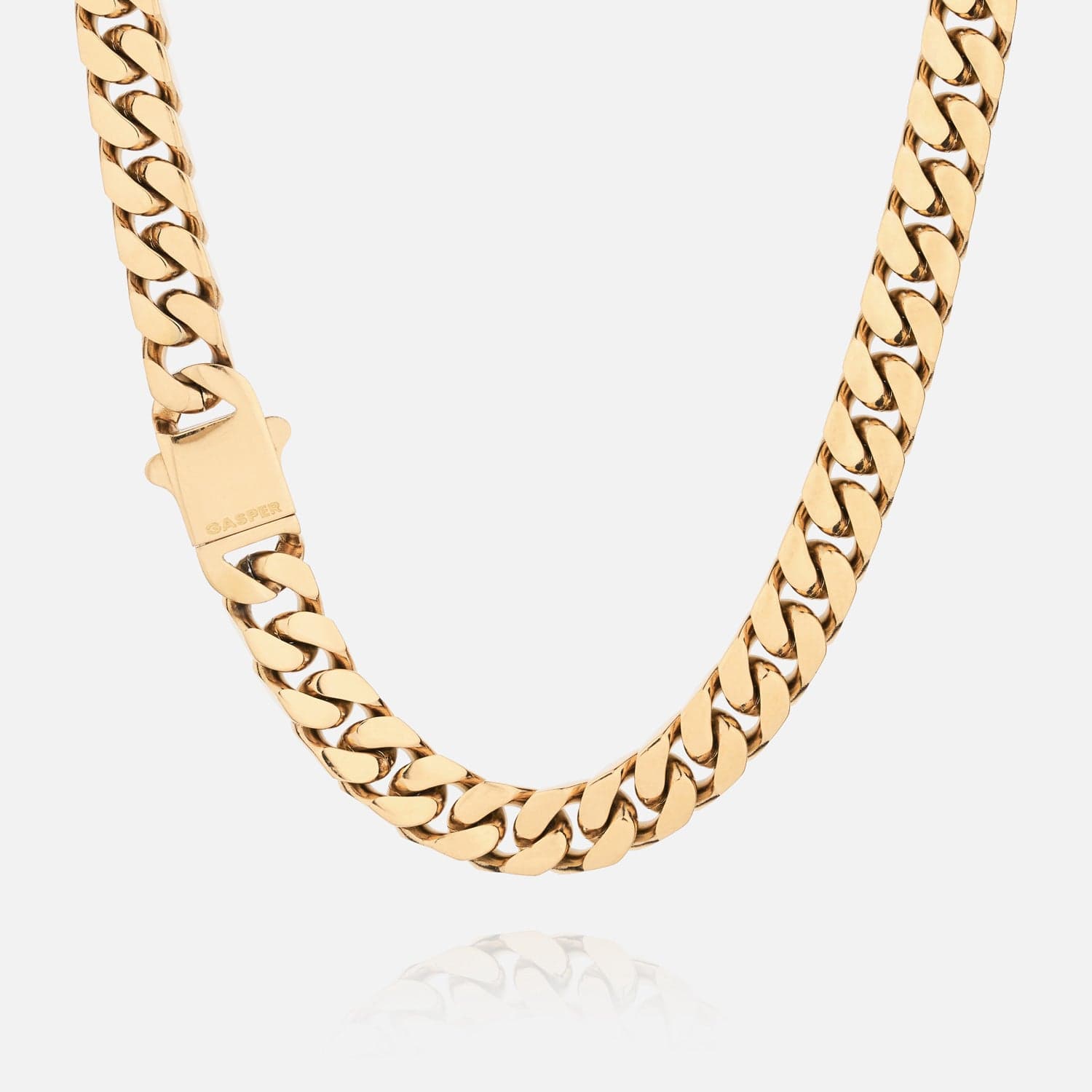 A clean Cuban chain with a straight cut that catches the eye. Features a branded buckle clasp.