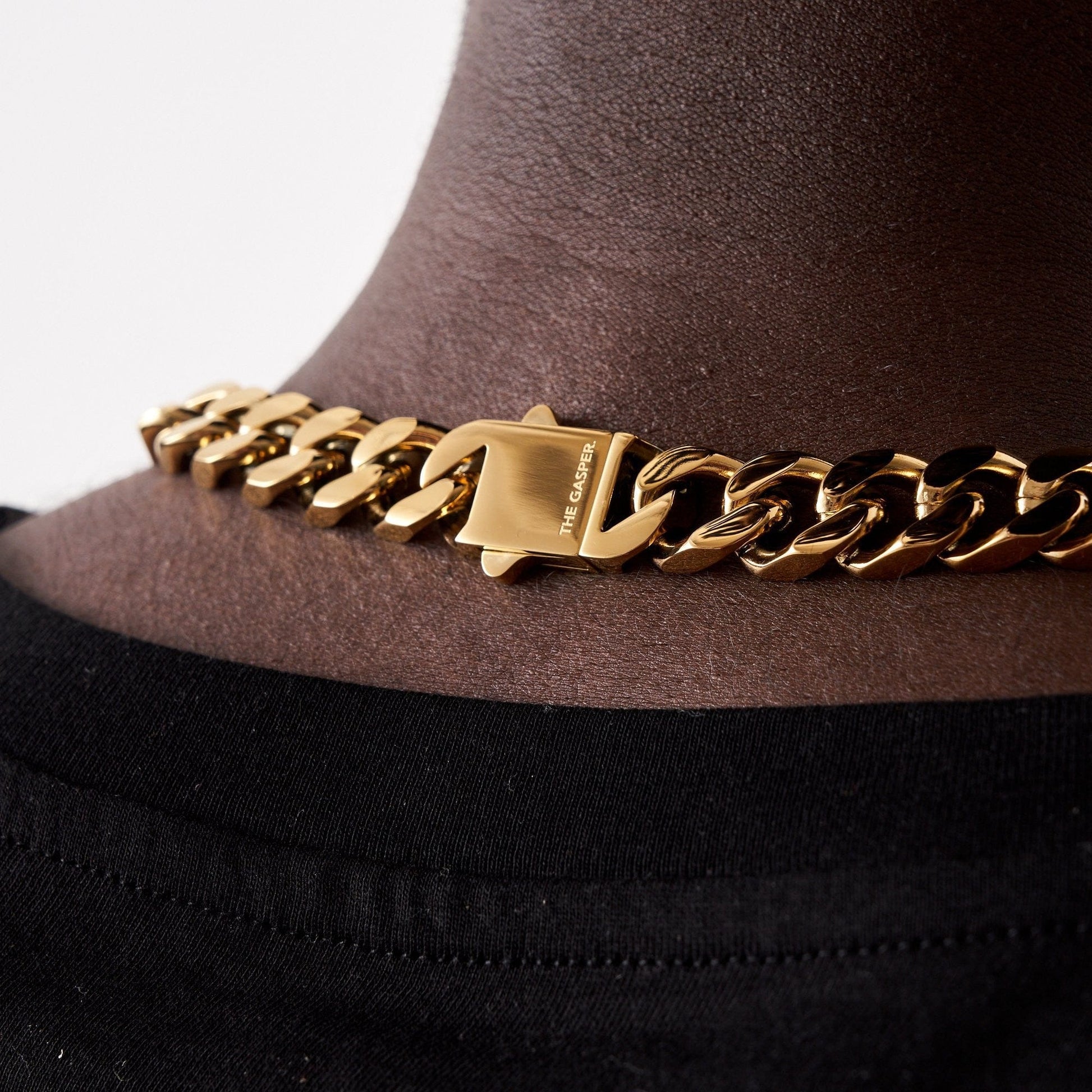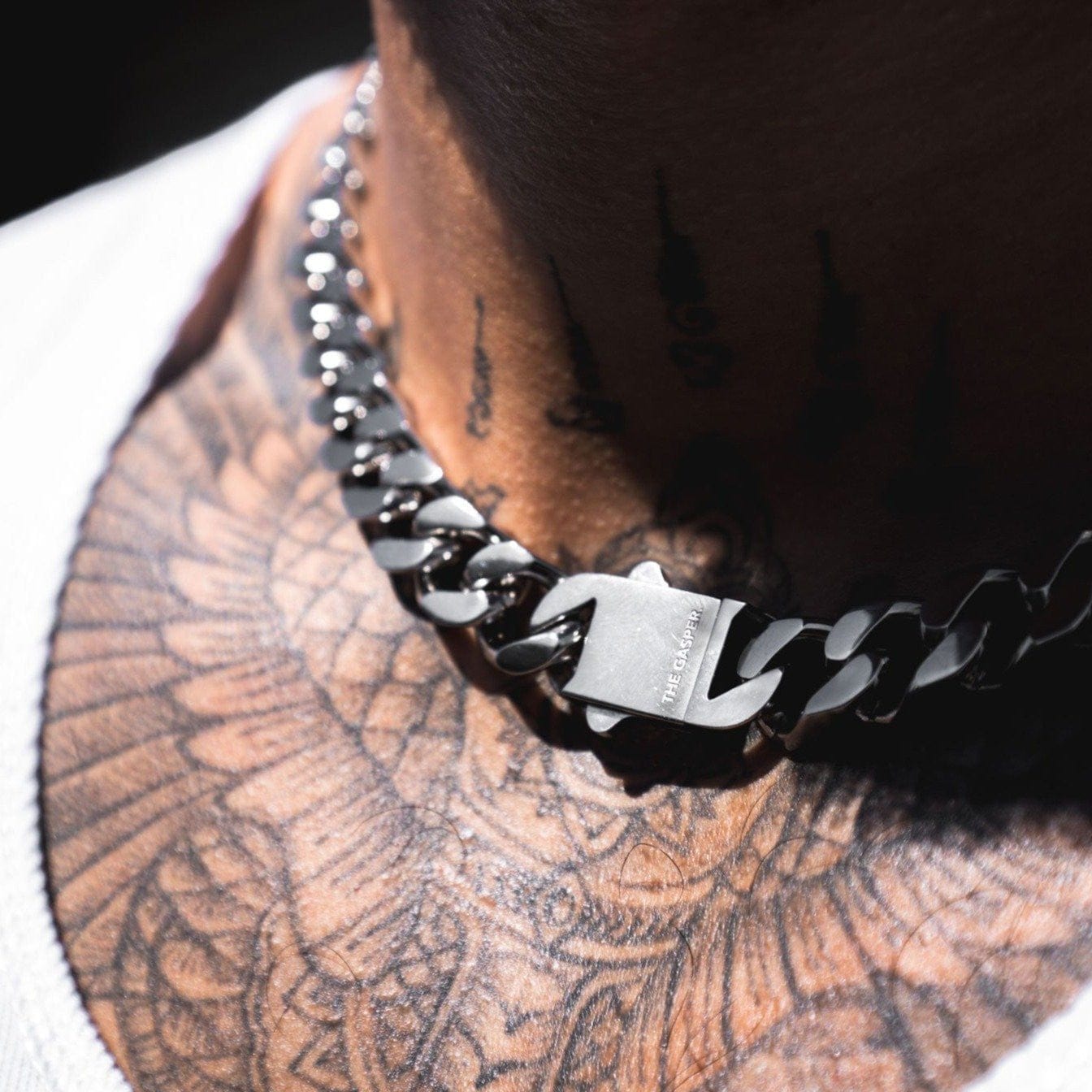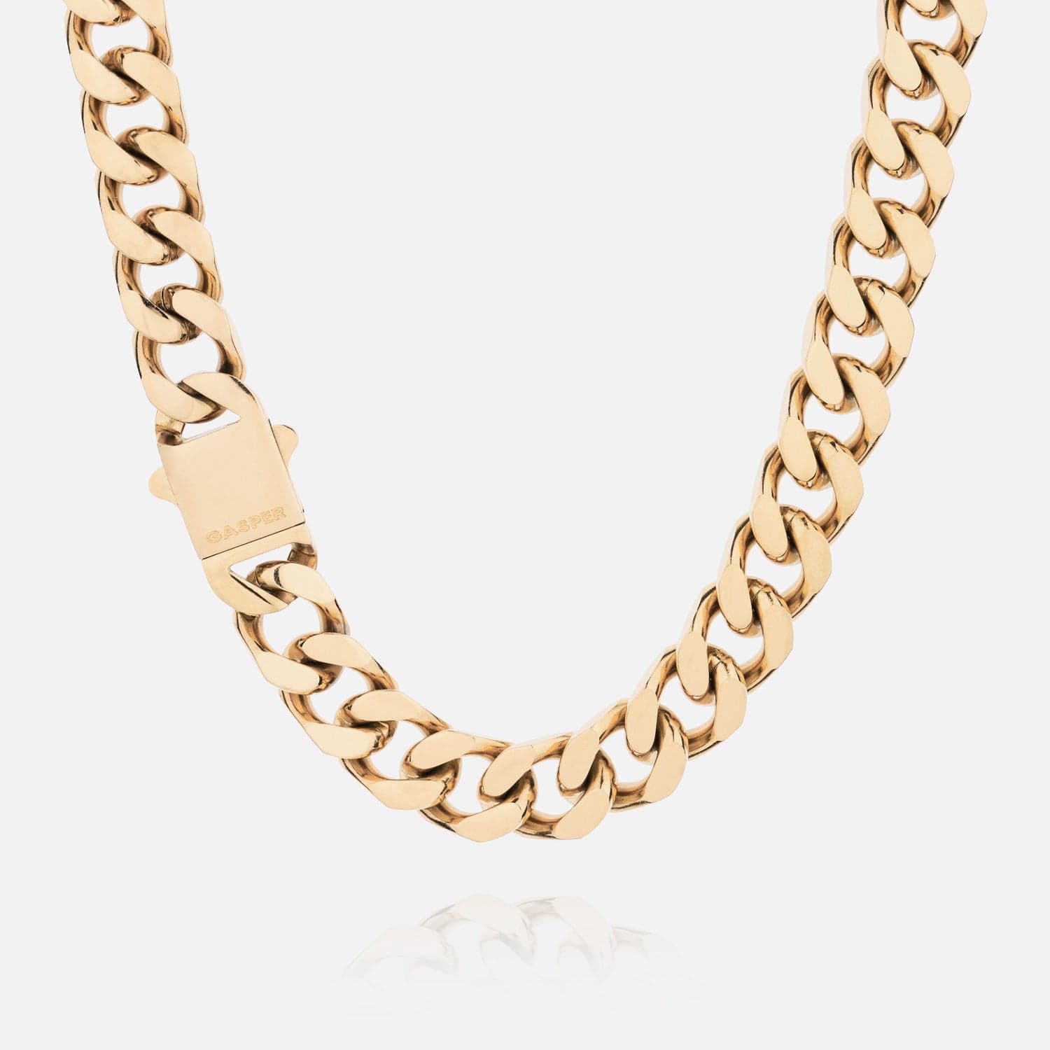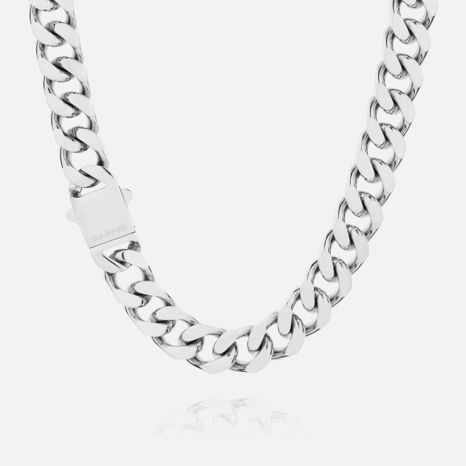 A clean Cuban chain with a straight cut that catches the eye. Features a branded buckle clasp.