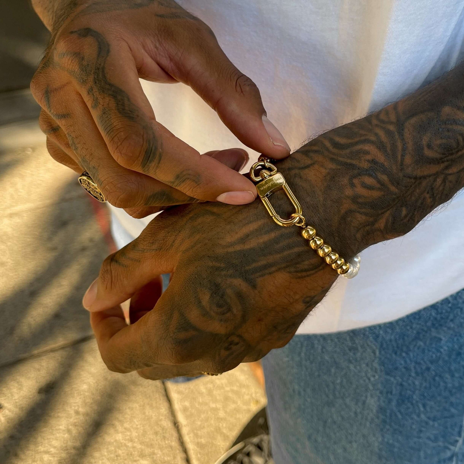 This unique bracelet is a contrasting mix between the classic and the modern, pearls and bead chain. A future streetwear classic.