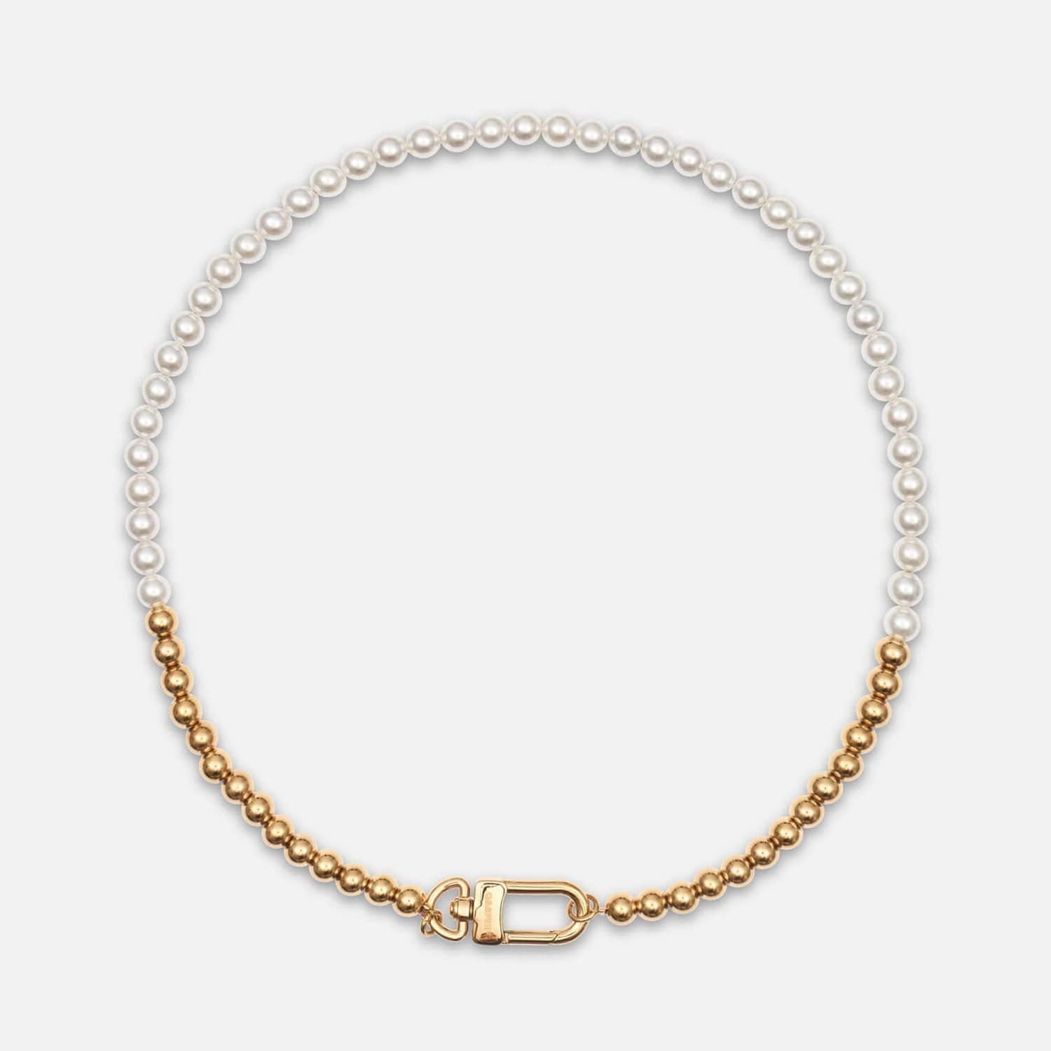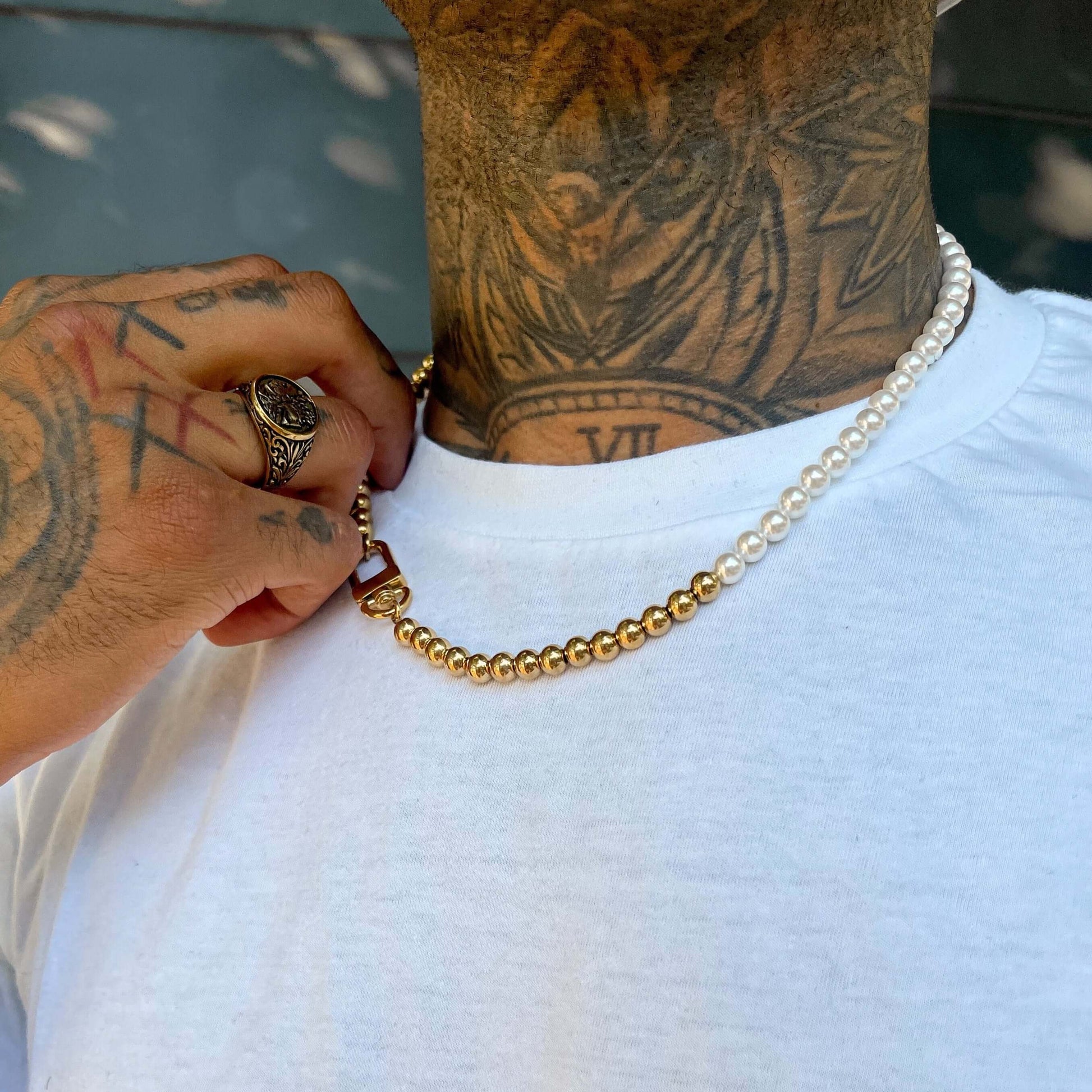 This unique necklace is a contrasting mix between the classic and the modern, pearls and bead chain. A future streetwear classic.