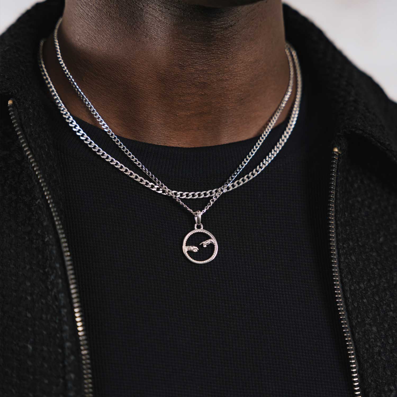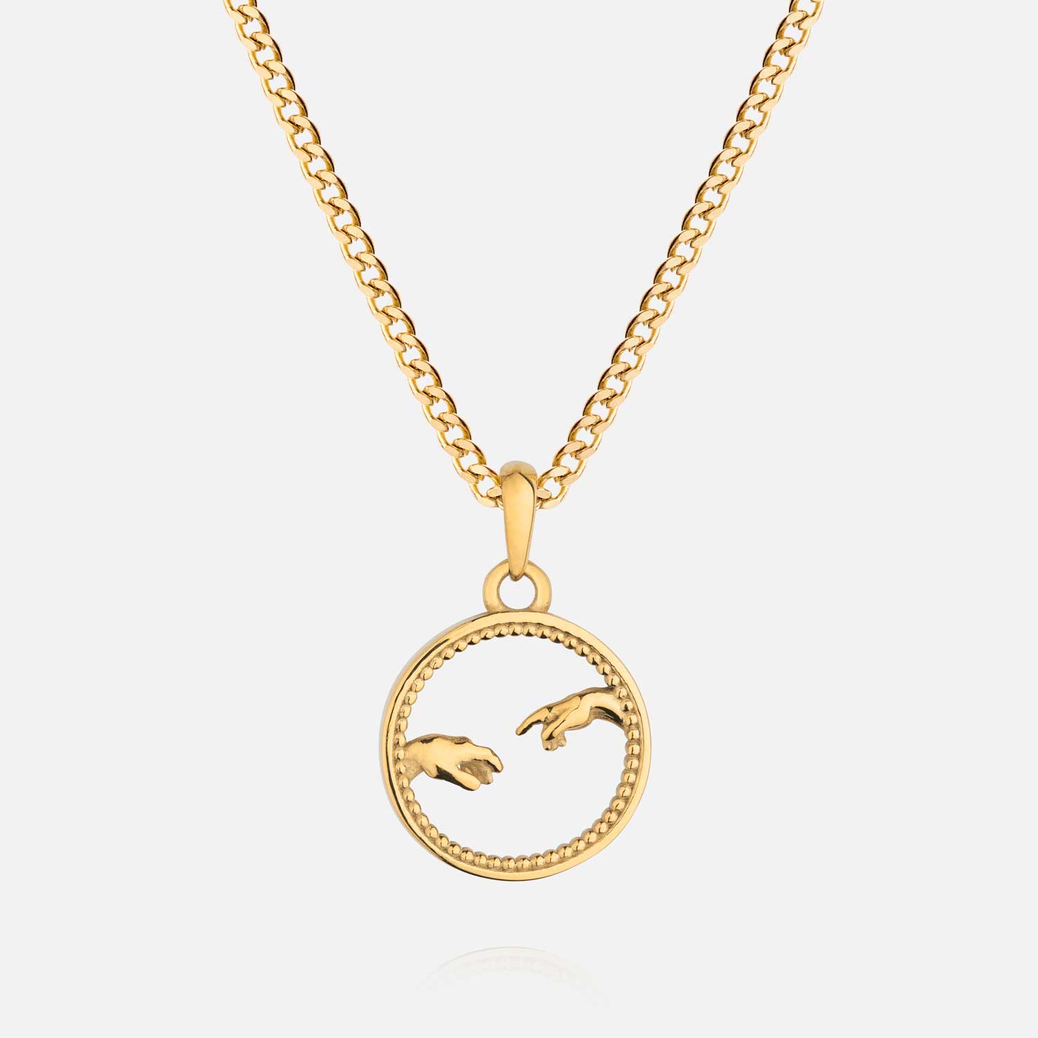 Inspired by Michelangelo’s The Creation of Adam, this minimalistic pendant distills the essence of divine connection into a sleek, understated design.