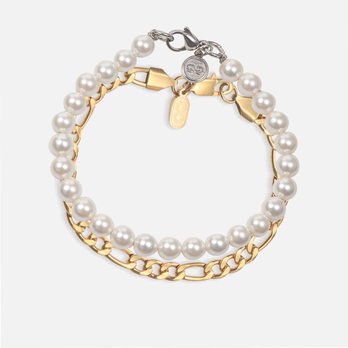 The set includes a Pearls bracelet and a clean 5mm Figaro bracelet. Both bracelets come in your chosen length.