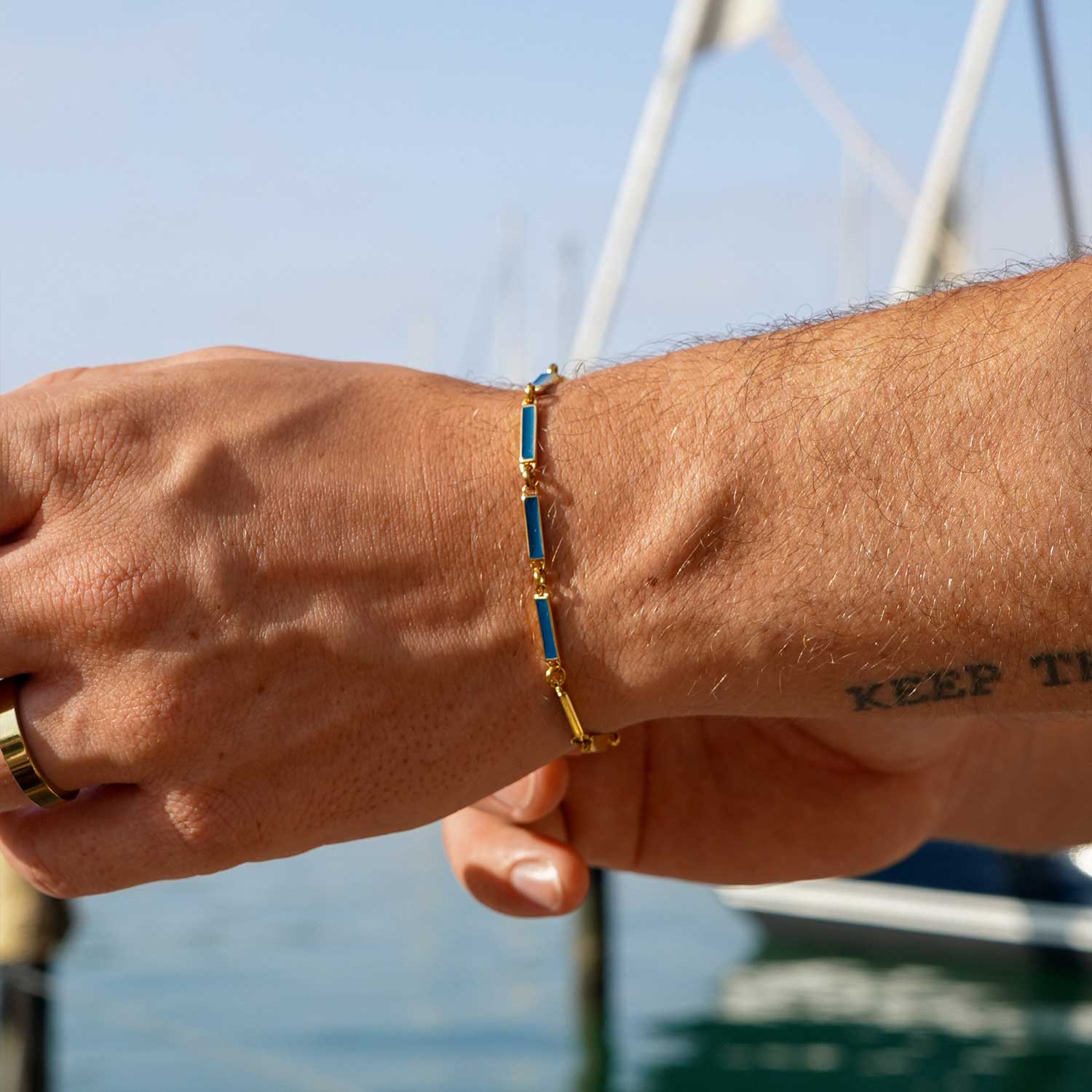 The Flush Bracelet in blue enamel reflects the depth and ease of coastal living. With its minimalist link design and a touch of Mediterranean inspiration, it brings a timeless sense of balance to your everyday style.