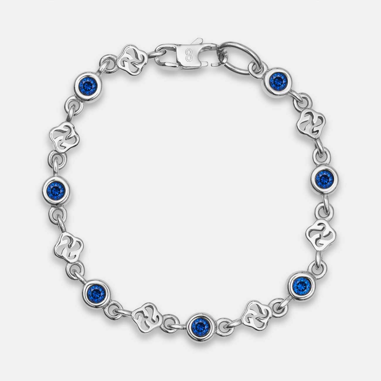 The Gemstone Bracelet is a mix of the rich blue Aquamarine stone and our Heritage motif that creates a vintage looking piece, finished off with a heavy-duty lobster clasp for maximum comfort and durability.