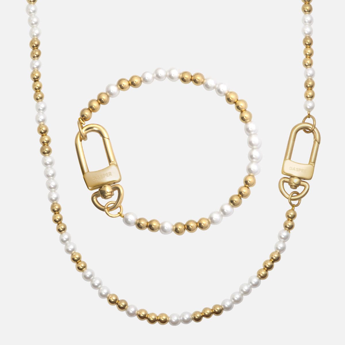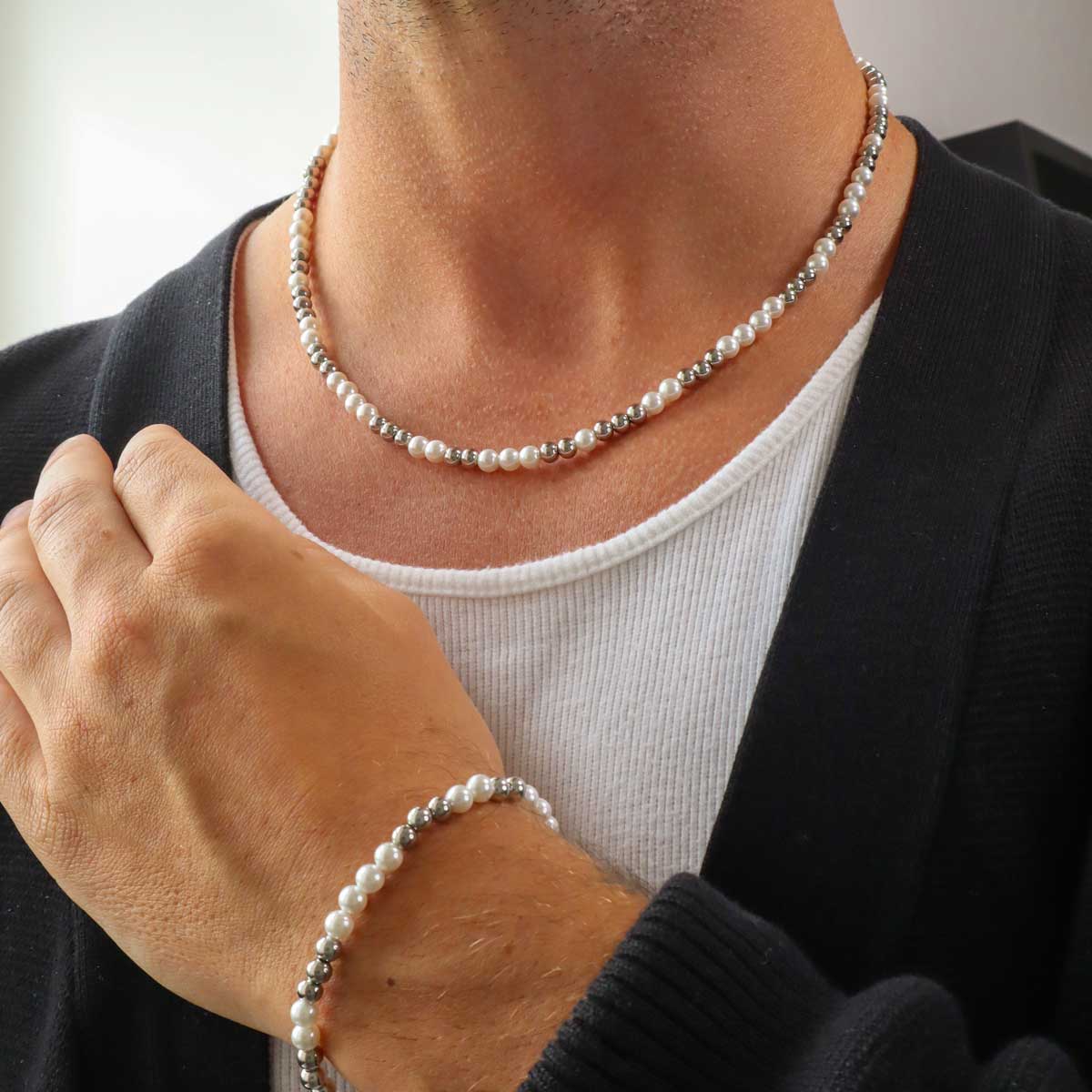 This unique bracelet is a contrasting mix between the classic and the modern, pearls and beads in between. A future streetwear classic.