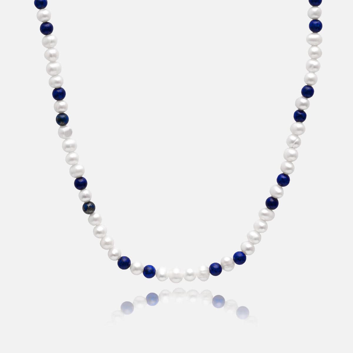 A piece that will be a guaranteed head turner. Natural white pearls complimented with deep blue Cobalt stones. Comes in 20" length with a 1.2" extension.