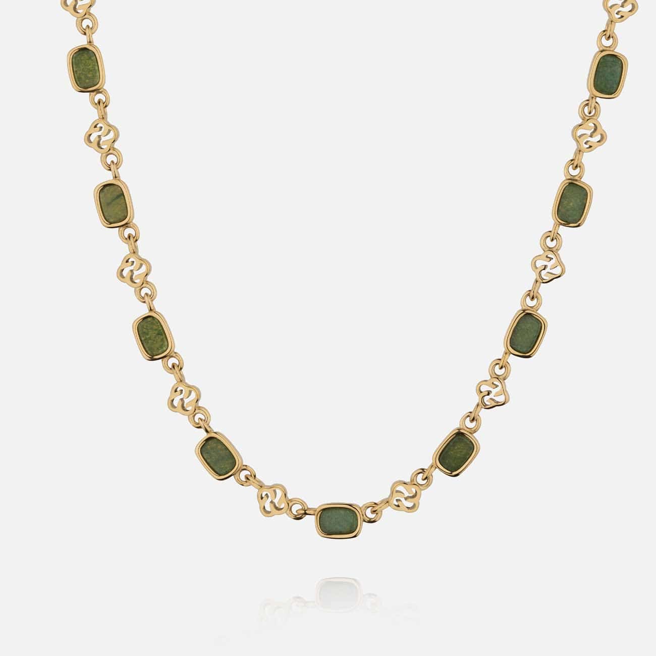 The Mineral Chain combines the rich green Aventurine stone with our Heritage motif to create a vintage-looking piece. It is finished off with a heavy-duty lobster clasp for maximum comfort and durability.