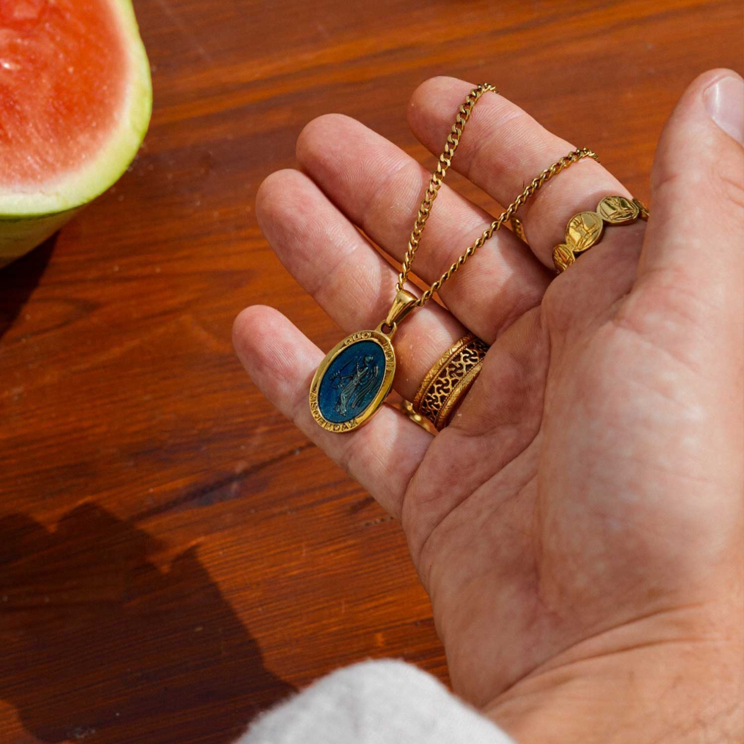 This version is accented with a deep blue enamel, evoking the Mediterranean waters where the piece was born.