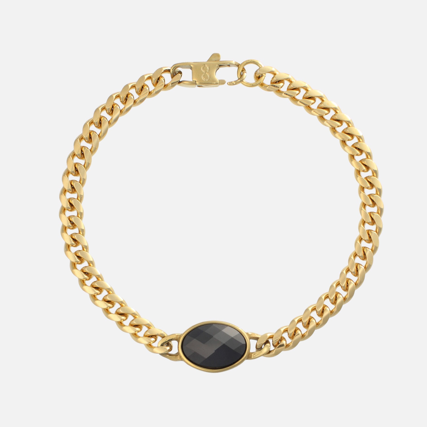 The Oval bracelet pairs a sharp 5mm Cuban chain with a bold faceted onyx stone — known for its protective, grounding energy. A clean, structured design with a subtle edge, secured by a sturdy clasp for all-day wear.