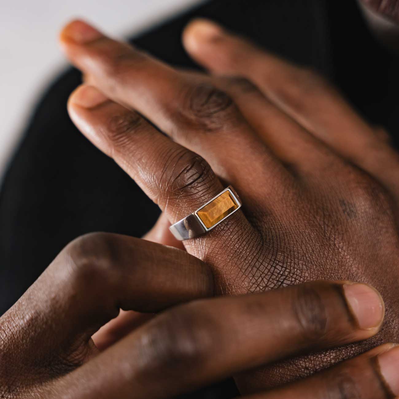 A modern take on a classic signet ring featuring a custom cut polished Tigers Eye stone handset in a clean bezel. Tigers Eye is believed to inspire strength, focus and willpower.
