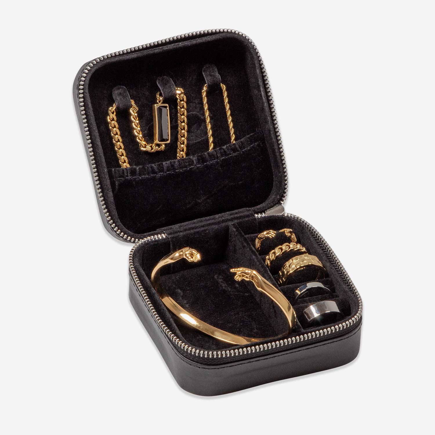 Large Travel Box can fit up to 7 rings, hang 2 necklaces with a scratch protection pouch and a larger compartment for pendants, bracelets and chains.